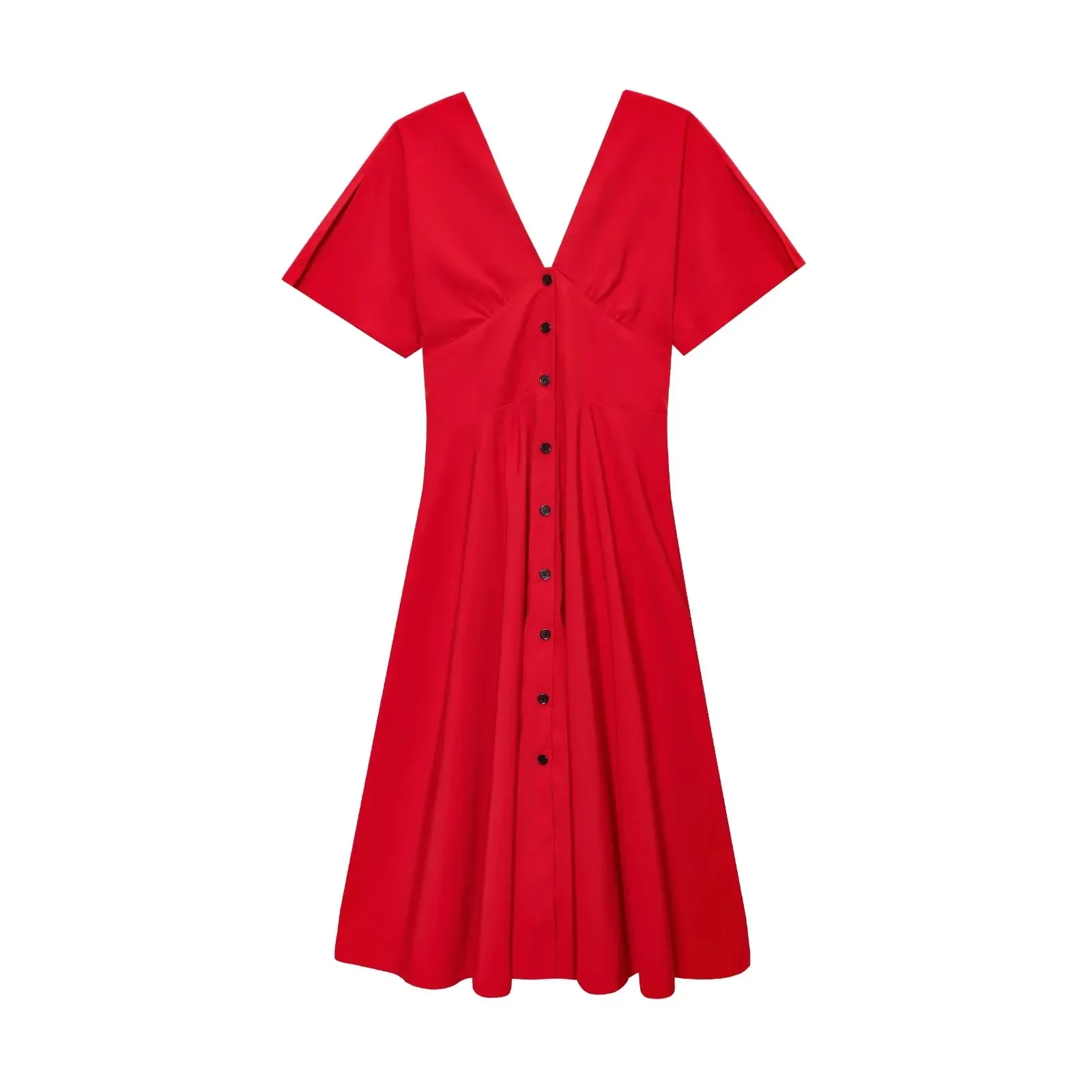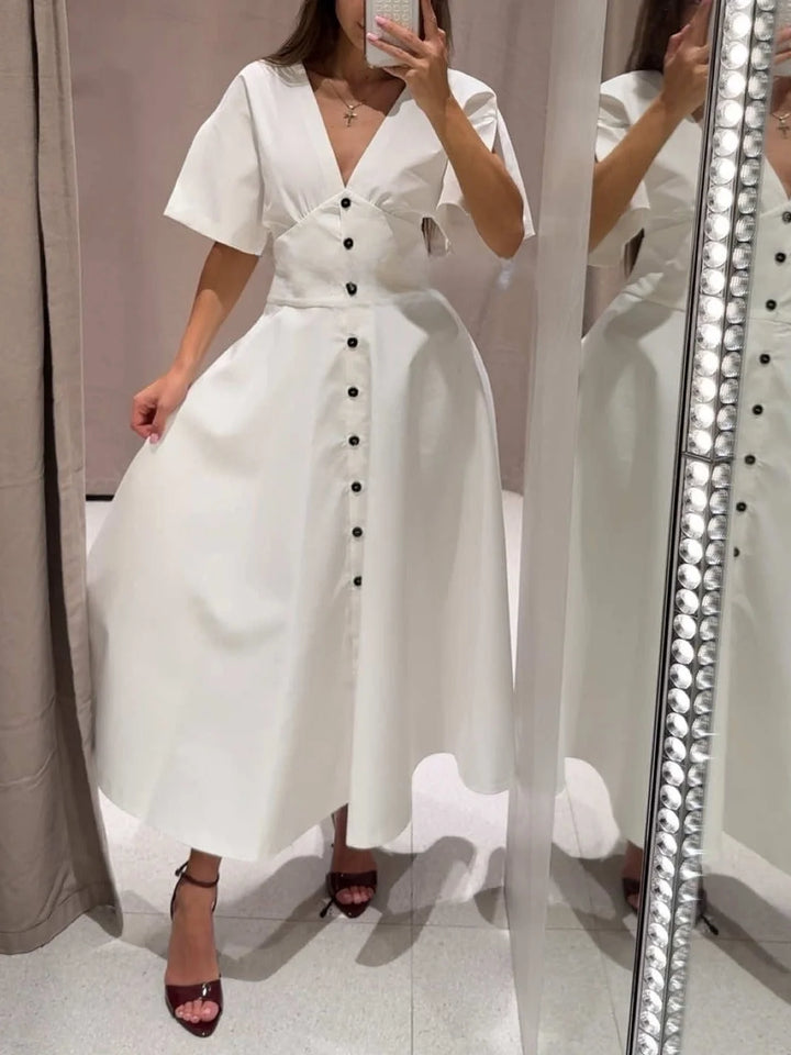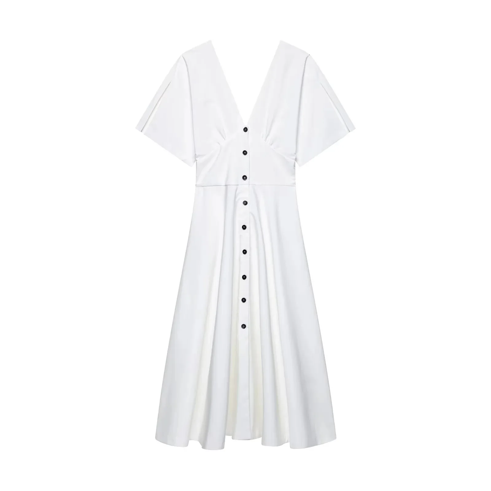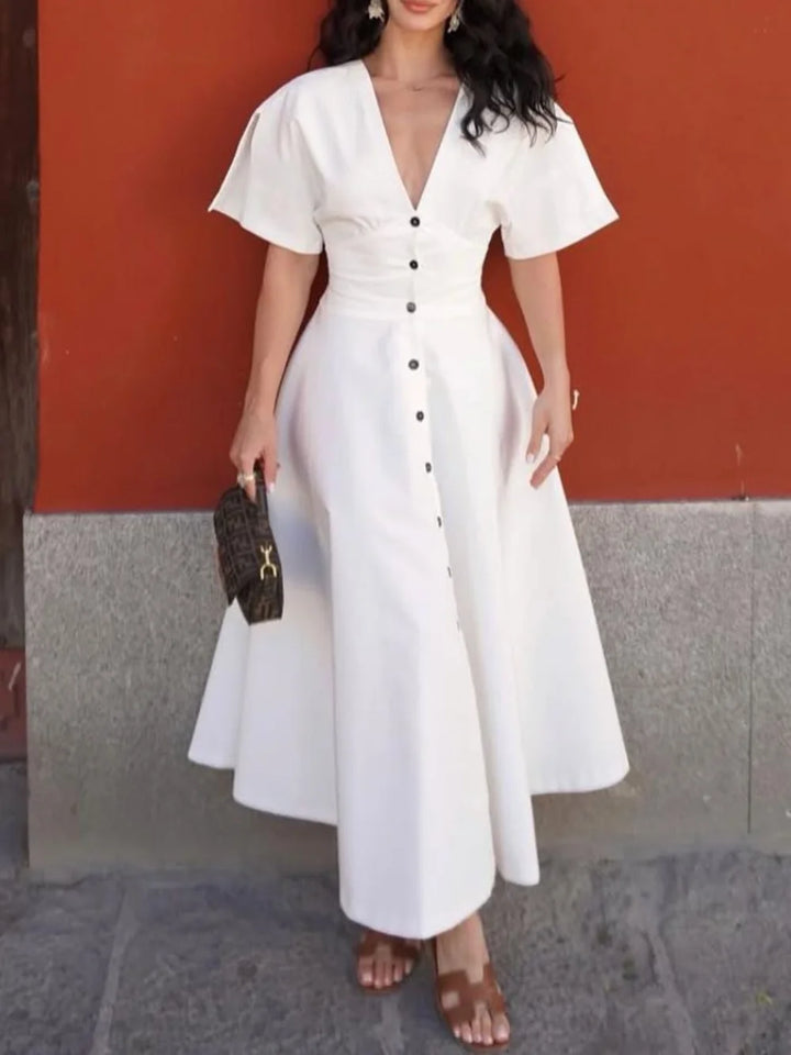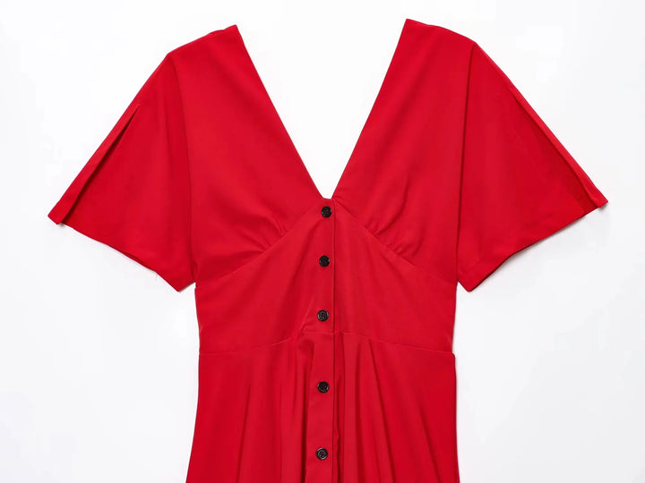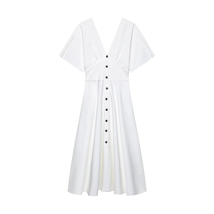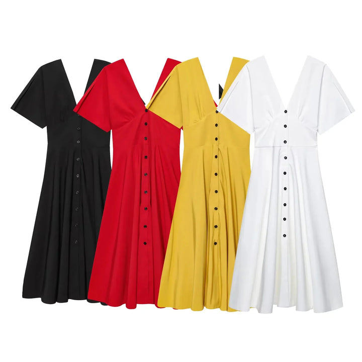 TAVIMART - Women's mid-length elegant dress button V-neck backless pleated dress new summer fashion holiday date casual dress