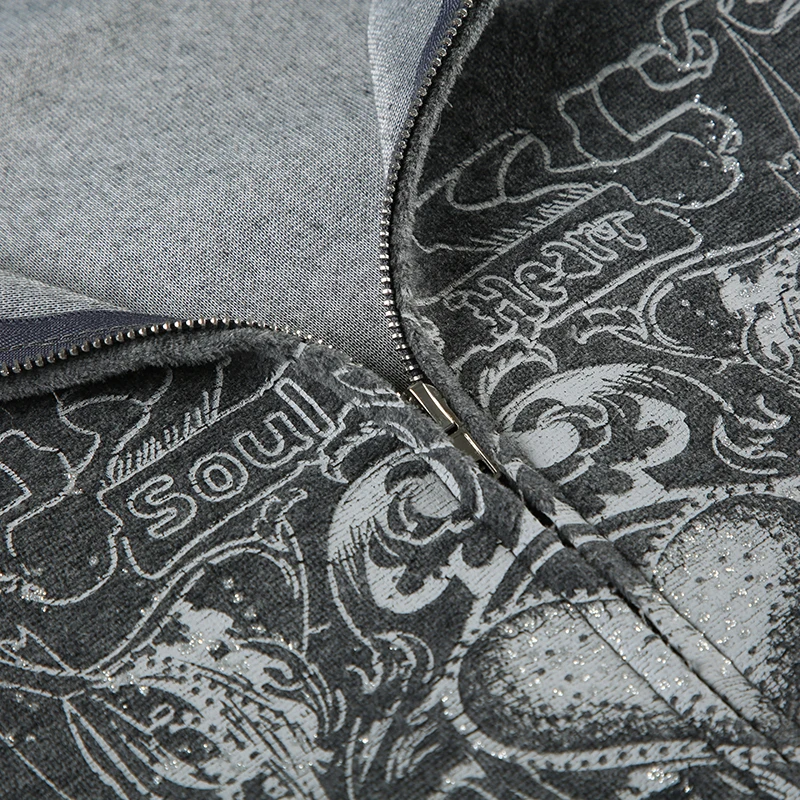 TAVIMART - Y2K Graphic Print Zipper Jacket with Hooded Vintage Aesthetic Gray 2000s Women Coat Knitted Outwear Autumn Outfits