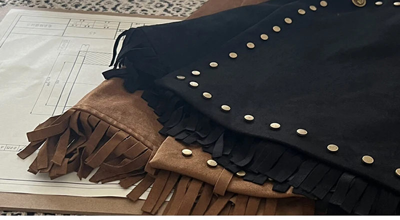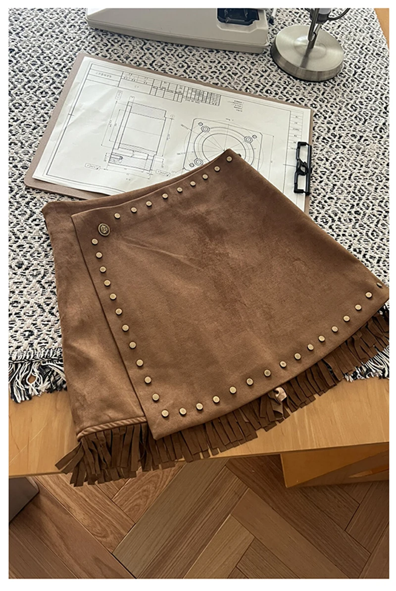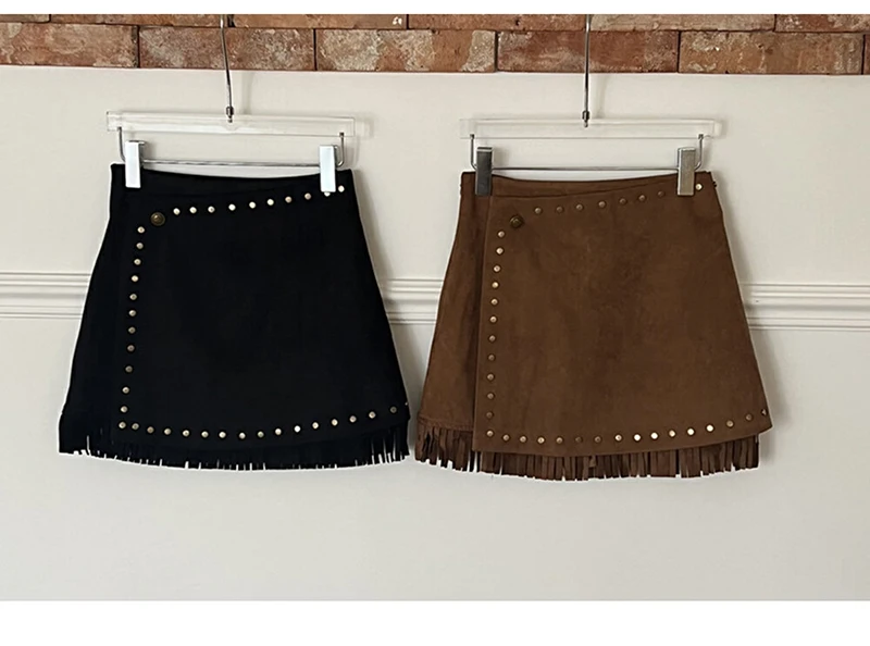 TAVIMART - Y2K Suede Rivet Mini Skirt Women Harajuku Vintage Tassel Patchwork Black Skirts Winter Gyaru Streetwear Grunge Slim Faldas New
