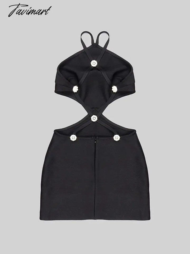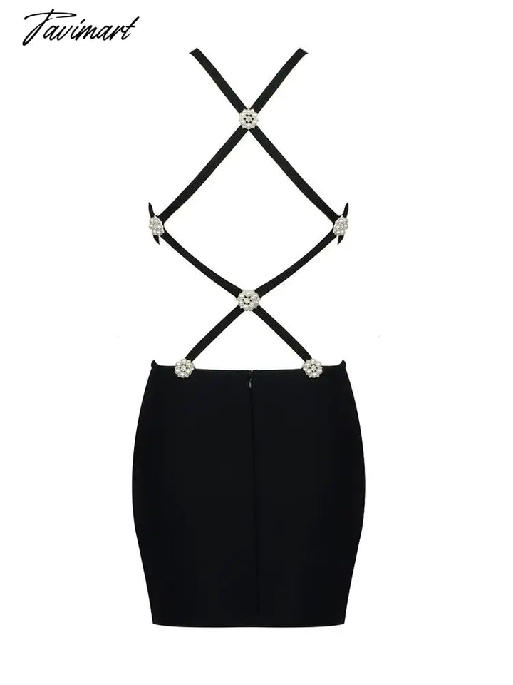 Women Summer Fashion Sexy Backless Pearl Crystal Black Diamonds Bandage Dress Knitted Elegant Evening Club Party Dress